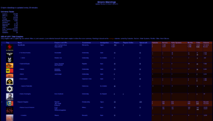 During the MMO, Empire Standings were available on the main Hazeron website. It was a leaderboard of ranked empires, and displayed information such as their total colonized sectors, solar systems, worlds, cities, along with their government types, spacecraft, players, loyal citizen counts, and more. It also displayed universe total statistics (including unranked empires), such as the total amount of avatars, officers, cities, explored solar systems, etc. An empire needed to have an empire capital city in order to be considered a "Ranked Empire" and tallied on the Empire Standings page of the main website. From 2017 onwards, empires would also need cities in at least two solar systems to be ranked. The winner of each universe was considered the empire at the top #1 spot when the universe ended.