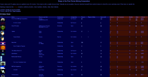 Before 2013, the page also contained a link to the 3D Galaxy Viewer. This was the predecessor of the Star Map. It showed the location of every empire in the game, from a source file named empiredata.txt. Its removal in 2012 caused some drama due to claims that it could be used to prevent griefing.